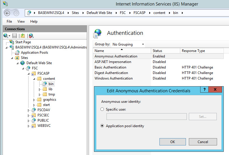 On Microsoft Windows environments, enable anonymous access to the Fabasoft Folio Web Service and disable all other authentication methods. Ensure that the Application pool identity is used for the Anonymous Authentication method.