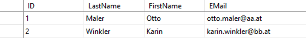 The property E-Mail Addresses (COOMAPI@1.1:emailinformation) is an aggregate. The single parts of the compound property can be addressed by a property path. To avoid duplicate entries (during multiple imports) the e-mail address is used as aggregate key (option “Aggregate Key”). Additionally select the option “Must Be Defined in Aggragate“ to avoid entries when there is no e-mail address and the option “Content as Value” to interpret the contents of the database as a value.