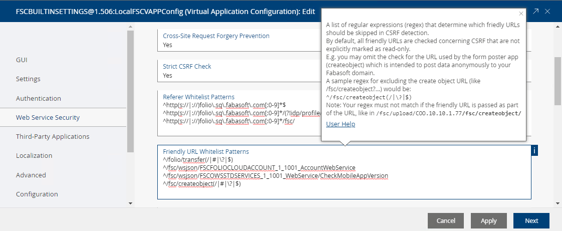 This setting only applies if “Cross Site Request Forgery” (CSRF) prevention is configured in the virtual application configuration (see FSCVAPP@1.1001:csrf and FSCVAPP@1.1001:csrffurlwhitelist of the FSCVAPP@1.1001:DefaultConfiguration for more details).