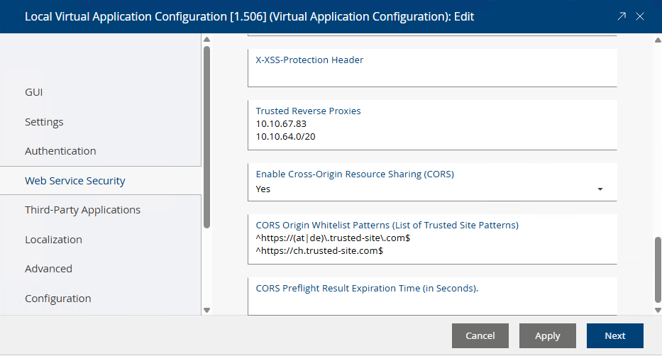 This setting defines whether Cross-Origin Resource Sharing (CORS) is allowed for the friendly URL. This setting only applies if Cross-Origin Resource Sharing (CORS) is enabled in the virtual application configuration. For the user agent (cross-origin web client) to use CORS, the origin (scheme, hostname, and port) must be trusted. This can be achieved by defining a regular expression (regex) and adding it to the list of trusted sites using the FSCVAPP@1.1001:corsoriginwhitelist property. For more information, see FSCVAPP@1.1001:corsenabled and FSCVAPP@1.1001:corsoriginwhitelist in FSCVAPP@1.1001:DefaultConfiguration: new window.