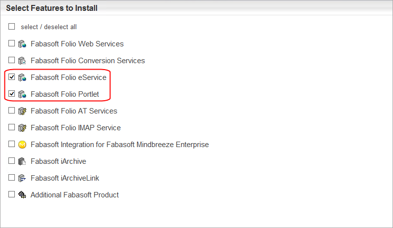 - Select the feature “Fabasoft Folio Portlet”. If you do not have installed a Fabasoft Folio eService so far select this service too. Click “Next”.