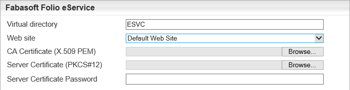 Defines the web site where the Fabasoft Folio eService runs. - CA Certificate (X.509 PEM)