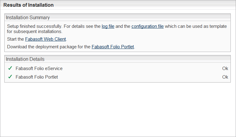 - After the Fabasoft Server setup has finished there is a Link to the Fabasoft Folio Portlet deployment package. So you can store the kit to a specific directory. By default it is stored in C:\Program Files\Fabasoft\Components\Setup\Folio Portlet\ on Microsoft Windows and in /var/opt/fabasoft/folioportlet/ on Linux.