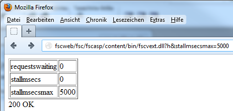 If all tests finish successfully, the HTTP status code “200 OK” is returned and status information is generated. The number of waiting requests for the Fabasoft Folio Web Service is shown in the requestswaiting field. The stallmsecs field shows how long no request could be processed. The time interval defined in the URL is shown in the stallmsecsmax field.
