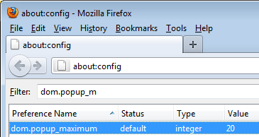Note: If you want to open more than 20 pop-ups type about:config in the address bar, search for the entry dom.popup_maximum and define the desired value.