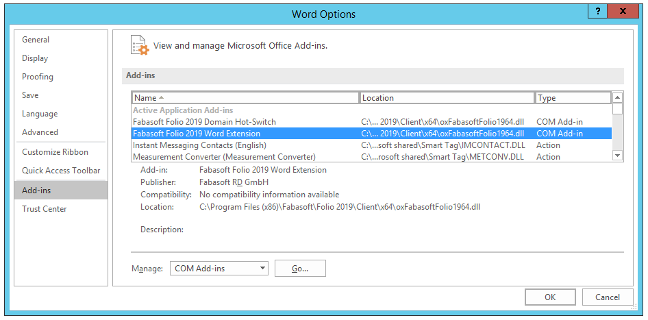 To be able to use the Microsoft Office buttons the Fabasoft Folio COM Add-in has to be enabled in the corresponding Microsoft Office application: