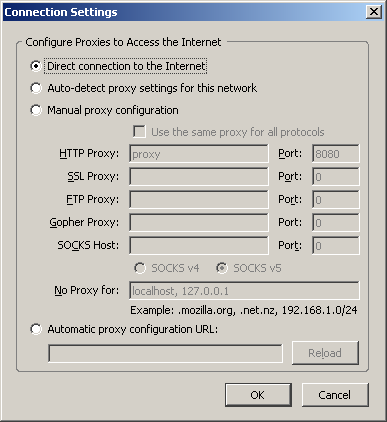 No proxy server may be used. On the “Edit” menu, click “Properties”. On the “General” tab, click “Connection Settings” and select the Direct connection to the Internet box.