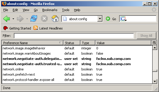 Enable the negotiate authentication for the Linux server running the Fabasoft Folio Management Service. Type the “about:config” command in the address bar of the web browser. Modify the parameters network.negotiate-auth.delegation-uris and network.negotiate-auth.trusted-uris and add the Linux server.