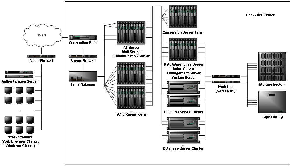 The backend LAN connects the web server with the backend server clusters and the conversion servers, plus the backend server cluster with the database server clusters. The backend LAN also connects the servers for basic services with the other servers. - Backend server cluster