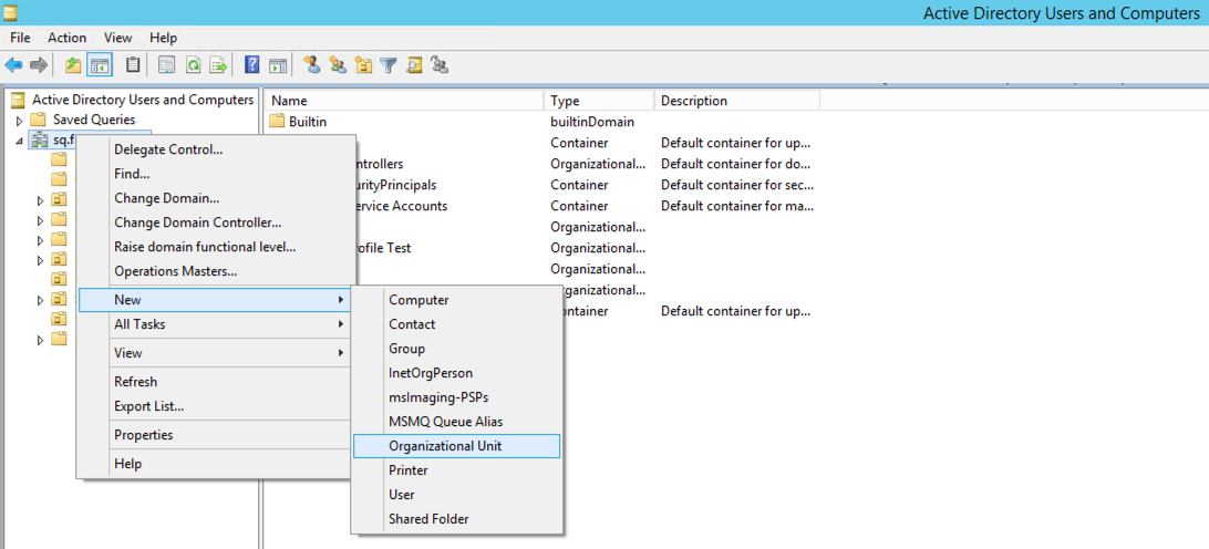- Navigate to the corresponding domain and create a new organizational unit (“New” > “Organizational Unit”).