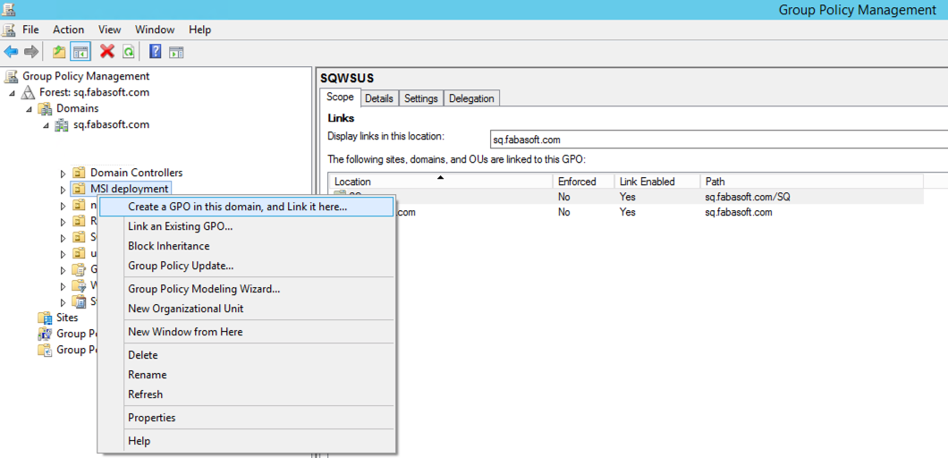 - Navigate to the organizational unit the users or computers were moved to and select “Create a GPO in this domain, and Link it here…” in the context menu.