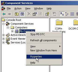 - In the Component Services navigate to the entry “My Computer” and open the properties (in the context menu of the entry “My Computer” select “Properties”).