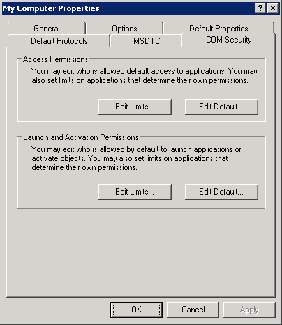 - Navigate to the tab “COM Security”. Edit the access permissions and the launch permissions after clicking the button “Edit Default”.